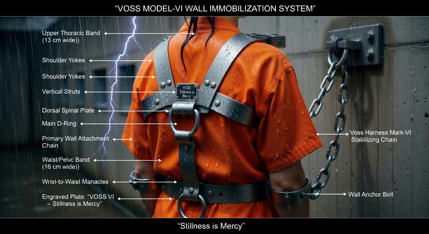Engraved plate on the back: “VOSS VI – Stillness is Mercy” (visible only to the prisoner if she could somehow look over her shoulder).