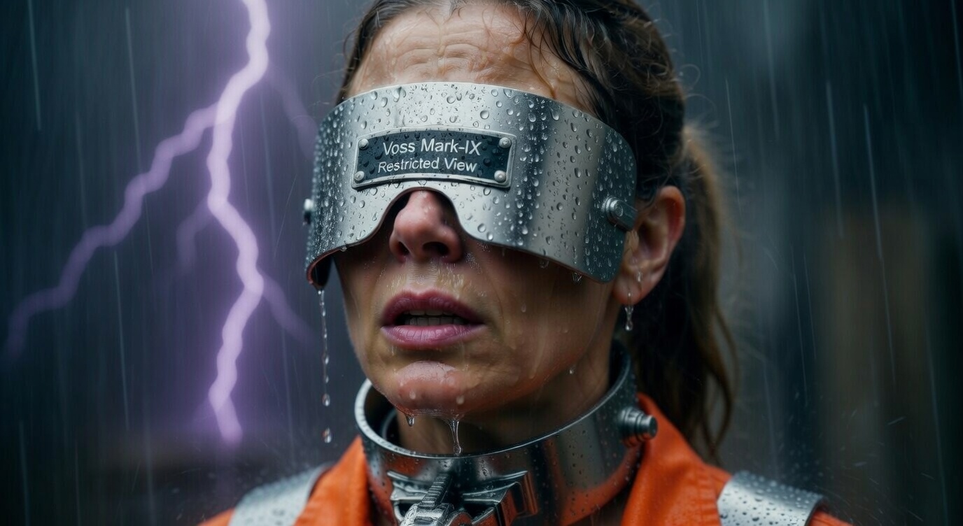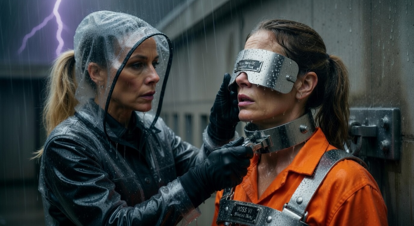 “Forty-eight hours. You are now wall, floor, steel, and darkness. The storm will speak to you. You will not answer.”The five women are now in the complete Voss Mark-IX System. Total physical immobilization + total sensory deprivation. Only the rain and thunder remain.Captain Voss walks the line slowly, her transparent raincoat glistening, baton tapping each blindfold plate in turn. The metallic clang echoes through the storm as she inspects her perfect creations.