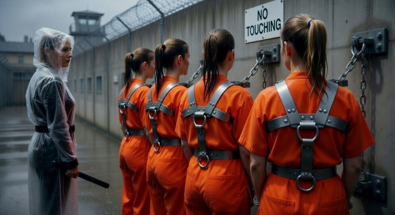 Elena never blamed the system. She blamed weakness. From that day she swore she would never again allow a single millimeter of slack in any restraint under her command. She requested — and received — permanent transfer to the female wing, where she personally designed the current wall-attachment protocol: zero forward movement, zero ability to turn, zero chance of “touching” anyone or anything.She wears the black leather uniform because it never softens in the rain and because the prisoners can see its outline through the transparent PVC raincoat — a constant reminder that the woman holding the baton is not wearing ordinary clothes.